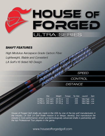Designed by world renowned golf shaft developer and engineer, Jeff Meyer. The House of Forged Golf Ultra shaft features aerospace grade, high modulus carbon fiber produced with the 16 sided HD design by LA Golf.